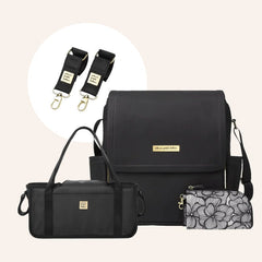 Boxy Backpack in Black Matte Leatherette, Wander Stroller Caddy & Stroller Clips Bundle