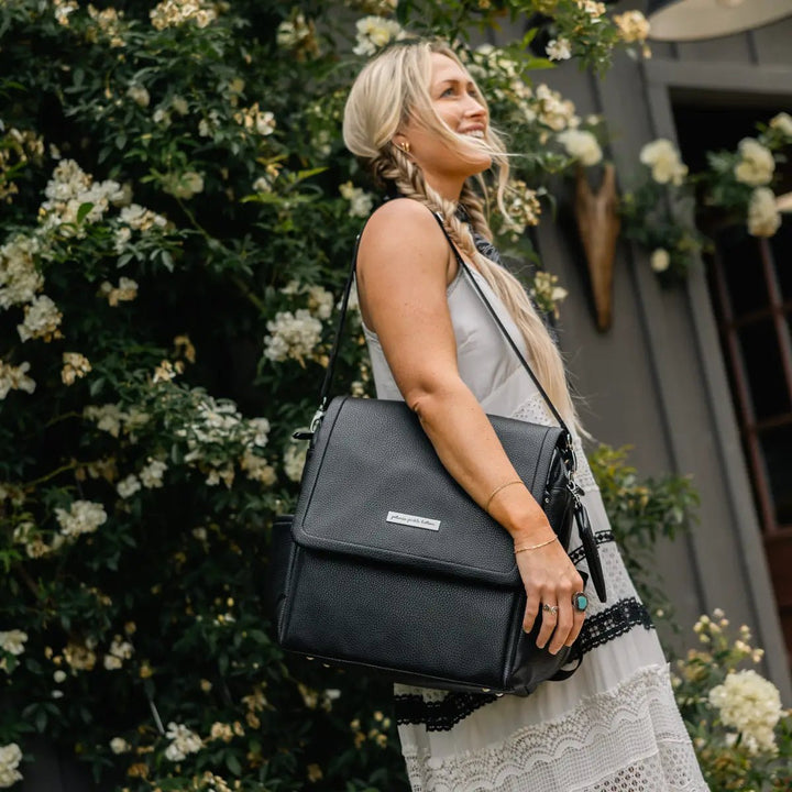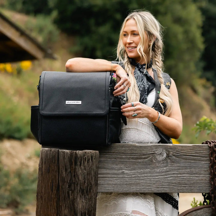 Petunia Pickle Bottom's Ebony leatherette adds a touch of classical elegance to any outfit. This gorgeous, vegan leather is naturally water-resistant and easy to wipe clean. Perfectly paired with silver colored hardware. Coordinates well with Stardust and Positive pattern accessories.