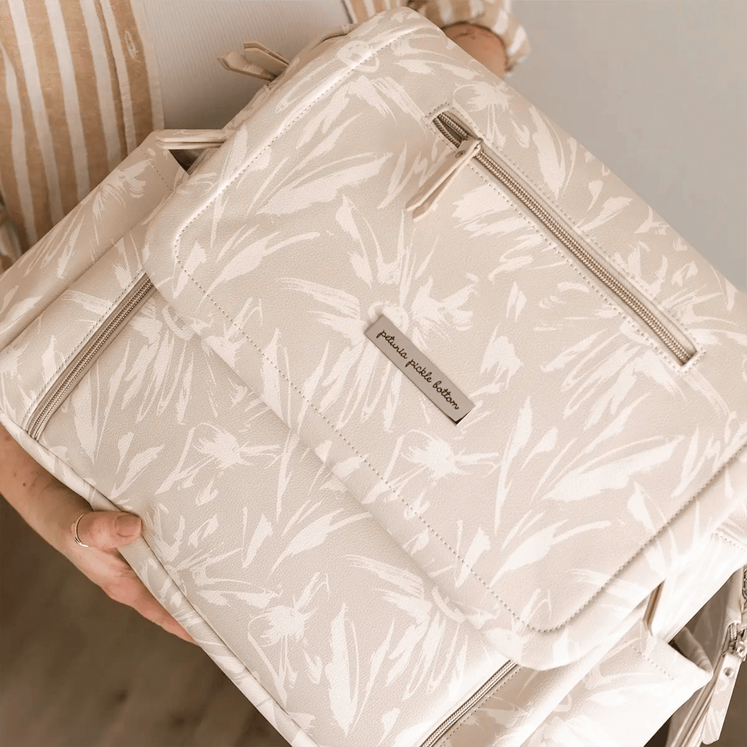 Petunia Pickle Bottom’s signature vegan leatherette fabrics are naturally water-resistant and can be cleaned with a damp cloth and mild detergent. Do not dry clean. Not machine washable.