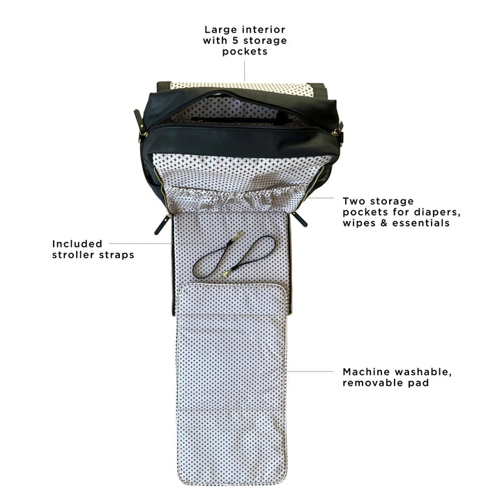 large 5 interior with 5 storage pockets. included stroller straps, two storage pockets for diapers, wipes & essentials, machine washable, removable pad