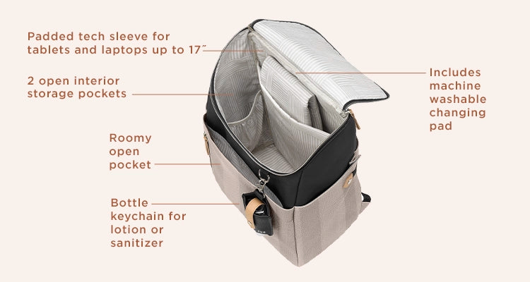 tempo backpack has a felt lined pocket for mobile phone, roomy open pocket, bottle keychain for lotion or sanitizer, includes machine washable changing pad, 2 interior storage pockets, and padded tech sleeve for tablets and laptops up to 17 inches