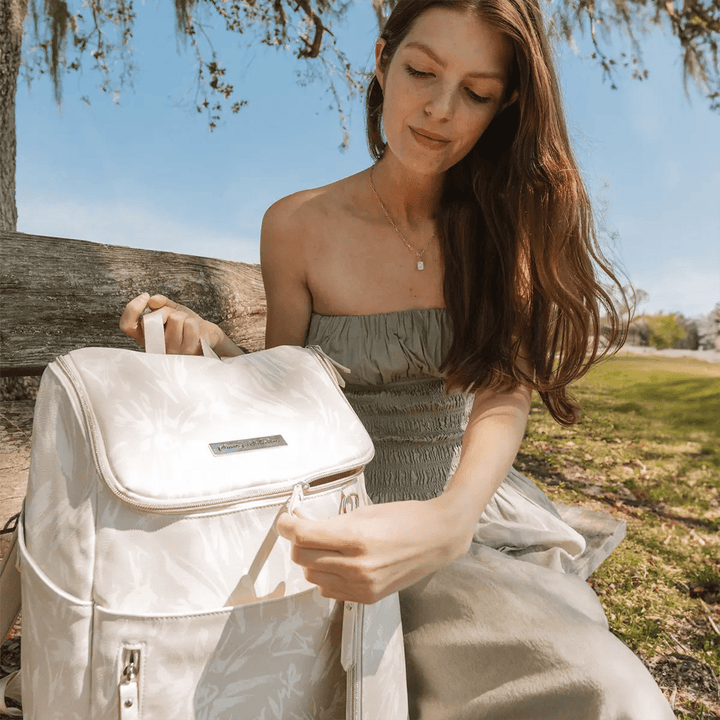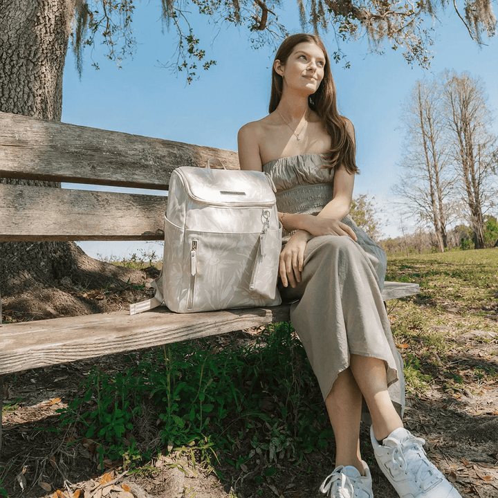 mom sitting on bench with the Tempo Backpack in Linen Blossom