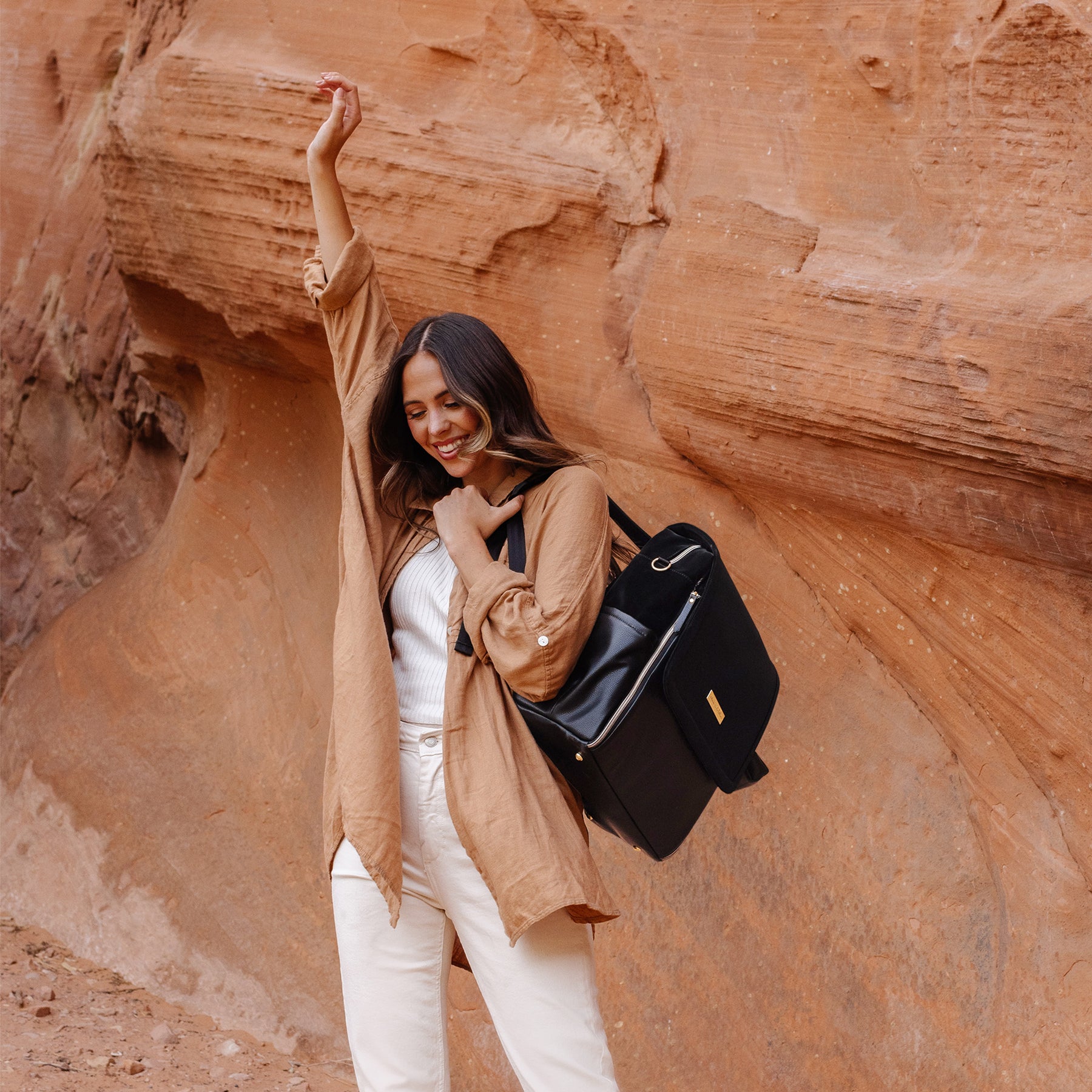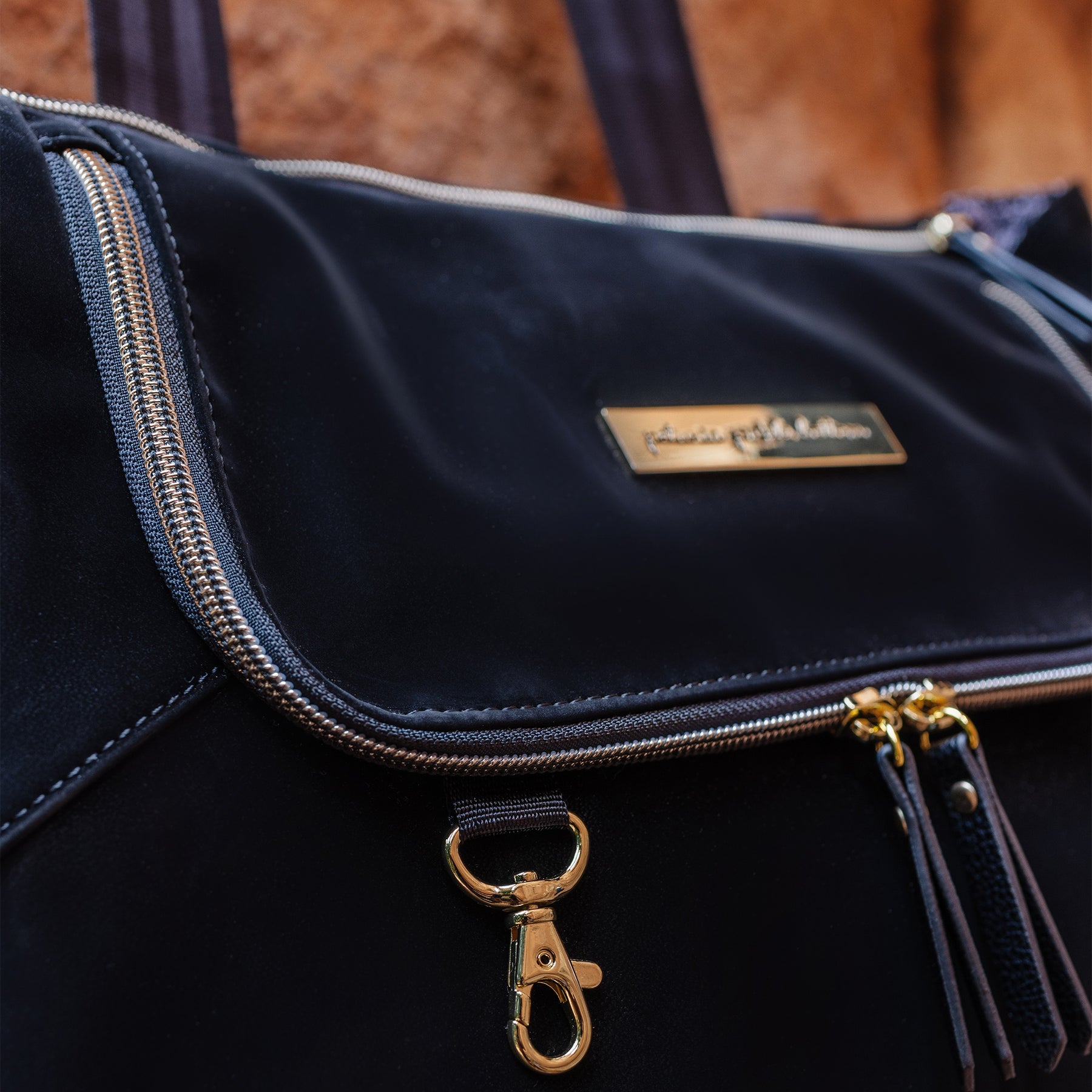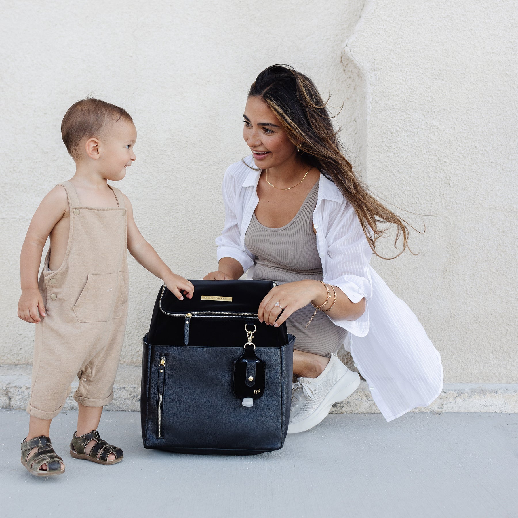 Premium fashion, meets high function. Our favorite diaper bag backpacks are styled to the max in our weather-resistant, velvetty-soft vegan leather textile. Adorned with gold hardware and a sprinkle of gunmetal the details are the star. Maximize the organizing magic with matchback accessories in Stardust print for the ultimate travel diaper bag or be prepared for the long-awaited arrival of your little one with the perfectly packed hospital bag.