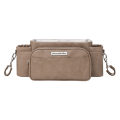 mom pushing stroller with the Wander Stroller Caddy Deluxe in Mink attached to the stroller bar